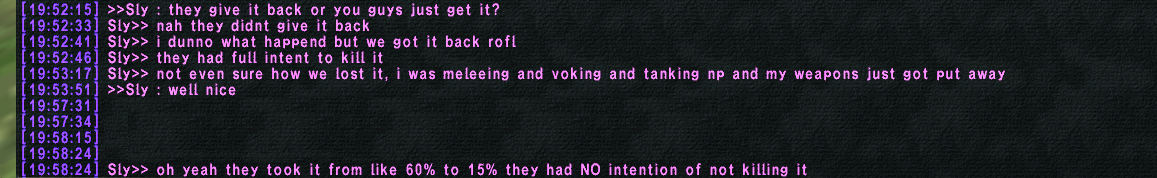 Nas should fix the no loot aspect of the 15 or 20m time limit(depending on ownm level) While obviously stealing the mob through a mistake in nas's coding is moronic to put it lightly, there is an issue here of being able to hold ownms past the point they wont drop loot anymore. That is griefing in my eyes, though not in the rules' eyes. Fun memory, deft. Man, ahriman is such a little turd. Instead of no loot, I think ownms should go into rage when the time limit is exceeded. No more enfeebles, no more regular damage taken. So jackasses who wanna hold the thing long enough so that noone can get loot can be punished and killed without nas having to police it. Either way, the 4 hour rule on mobs doesn't work for ownms because it is super simple to just hold those mobs endlessly with a single rdm and the time limit on the kill is 20 minutes, but the only reflection of that is in the loot pool. Make em rage.