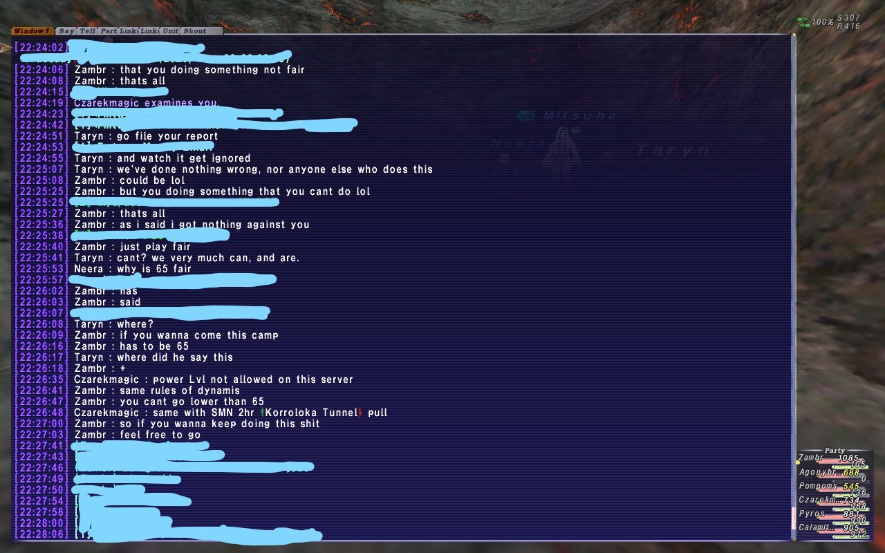 As for the Dynamis comment, you're referring to me when you came into Naschat crying about this last night. It was sarcastic, and I never said there were cheaters. They're cheating as much as the folks in your screenshot are, lol. Nasomi already knows about what happens in Dynamis, and it's also allowed. That was the joke. There are ways to gain XP by aga-ing down large amounts of mobs, it can be dangerous at times, requires good gear and teamwork. It's the point of the game. I said when "YOU" see what's happening in Dynamis your mind will be blown... not when Nas sees it. Nas isn't a moron, you appear to definitely be one.