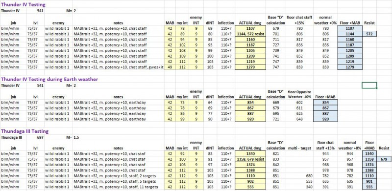 So first thing I did was going out to ronfaure and cast Thunder IV on wild rabbits with 78 INT, my inherent +32MAB and +10 from merits, and a chat staff. It hit for 1107.
