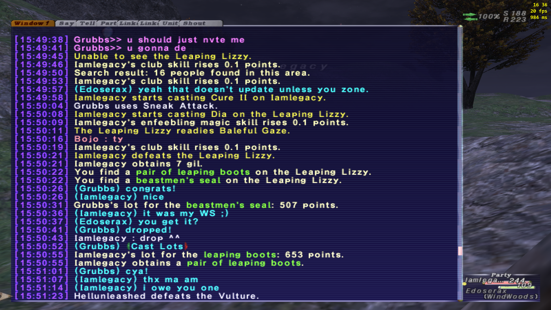 timestamp[15:50:21] Iamlegacy defeats Leaping Lizzy and finds a pair of leaping boots pluz beastman's seal. With the help og a lovely Tarutaru THF by the name of Grubbs(w/o even lotting mind you) and a shout out to my LS leader Edoserax who who'll been there but atm couldn't but did help earlier and suffer the long camp. I know you'd help buddy and many other did too, so you know who you are!