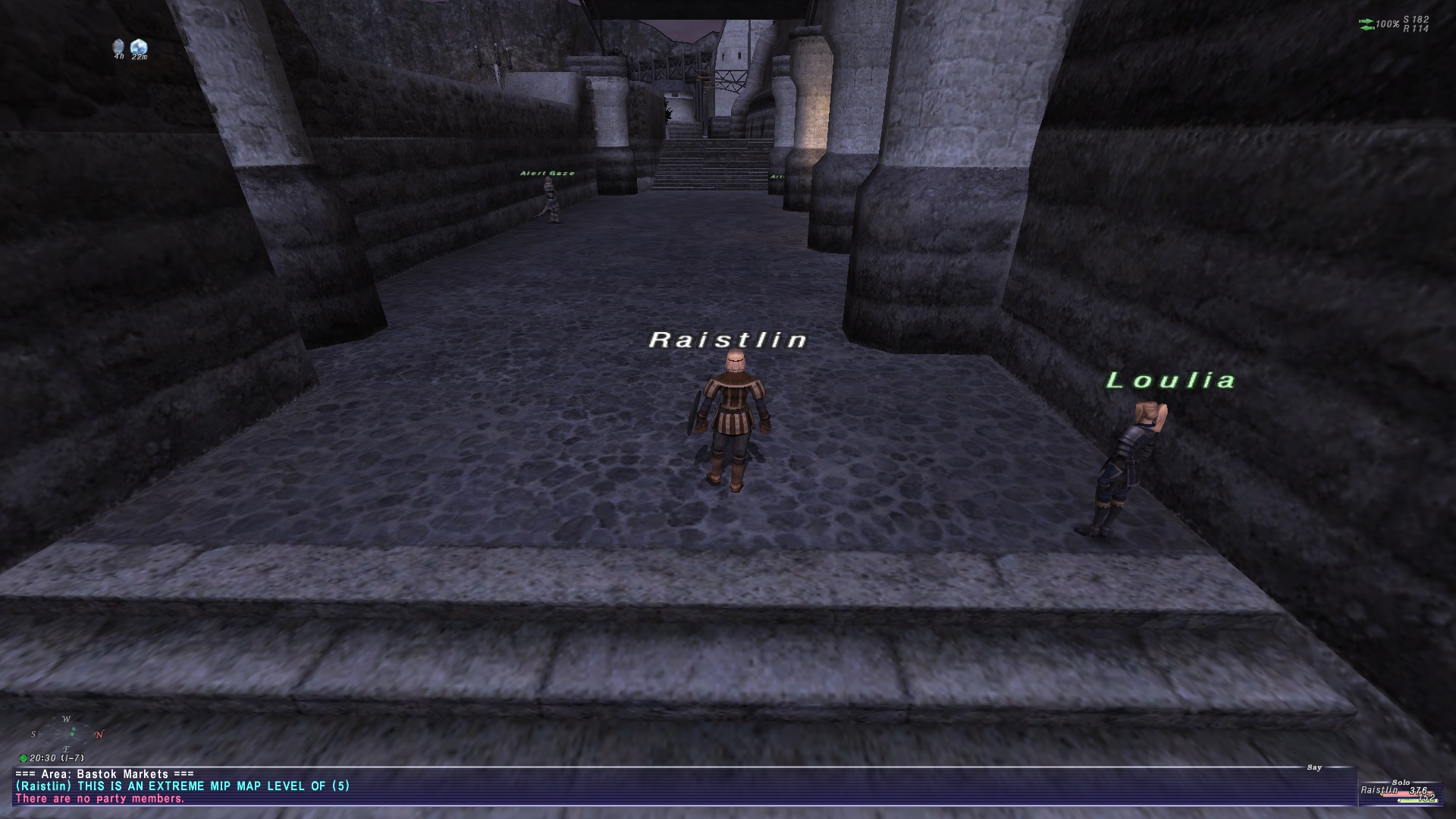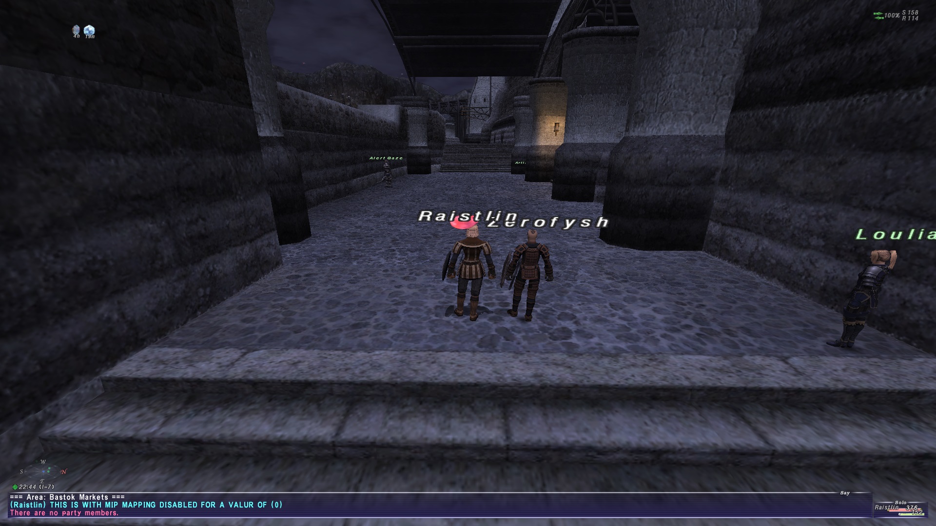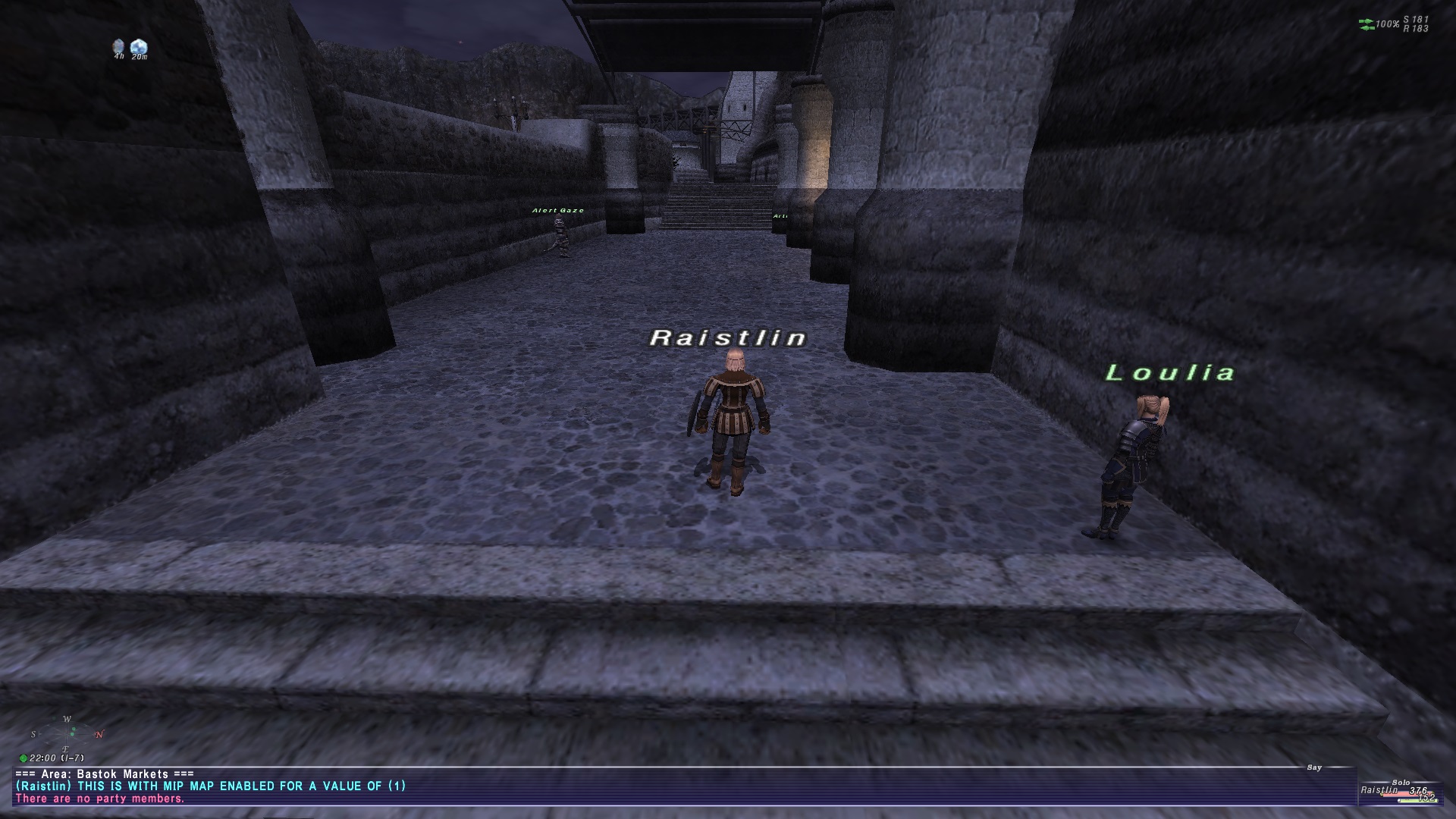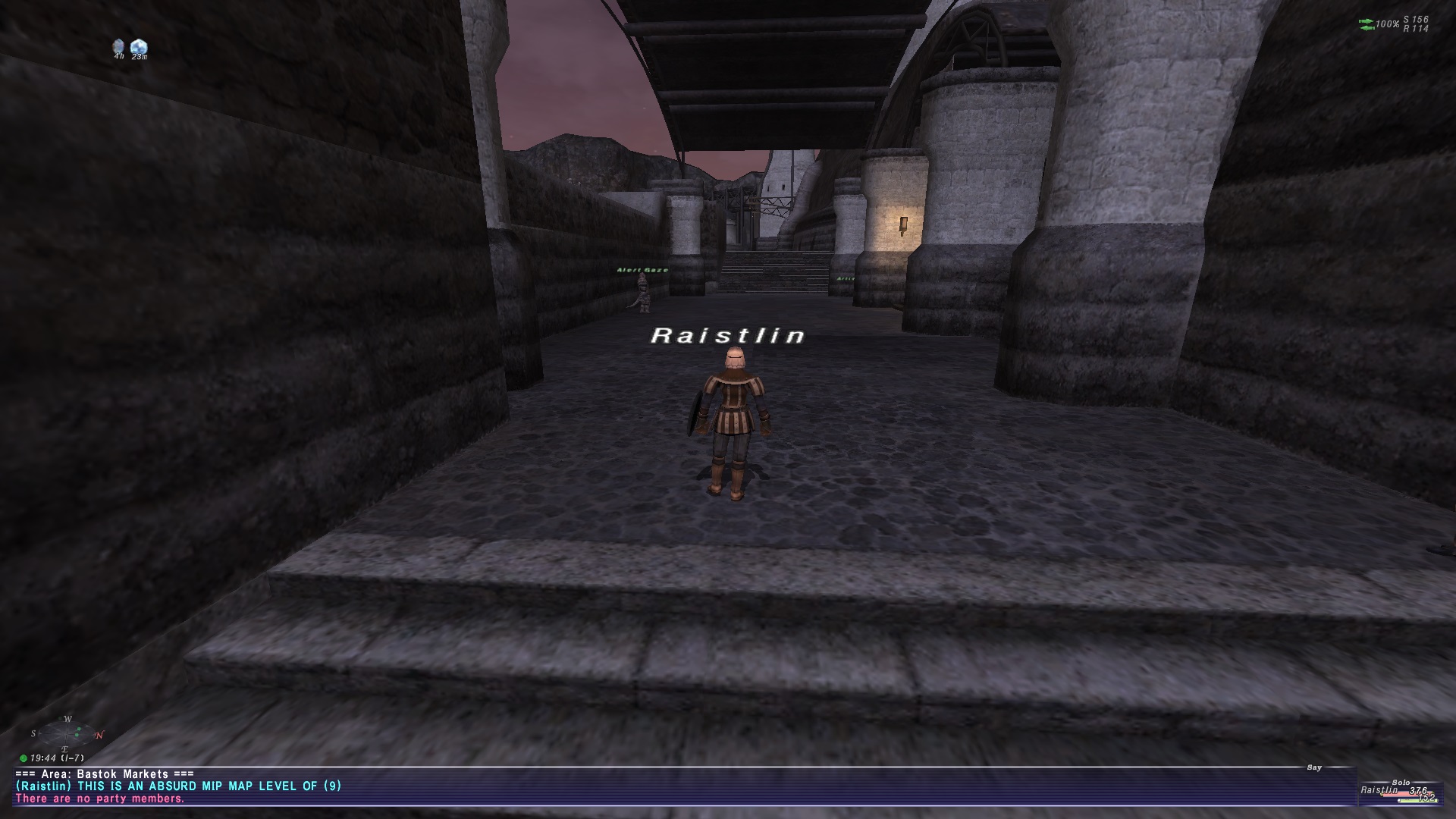 Just be mindful, if you go too high with it, it can REALLY muddy things up. But just a slight bump to 2 or 3 might mitigate enough of the distracting flickering to notch back background res if your laptops are struggling in the more complex situations. Tried to grabbing some screen shots from the mog exit to Bastok Markets. Hopefully the still shots demonstrate the range well enough. It is much more noticeable when moving around though.
